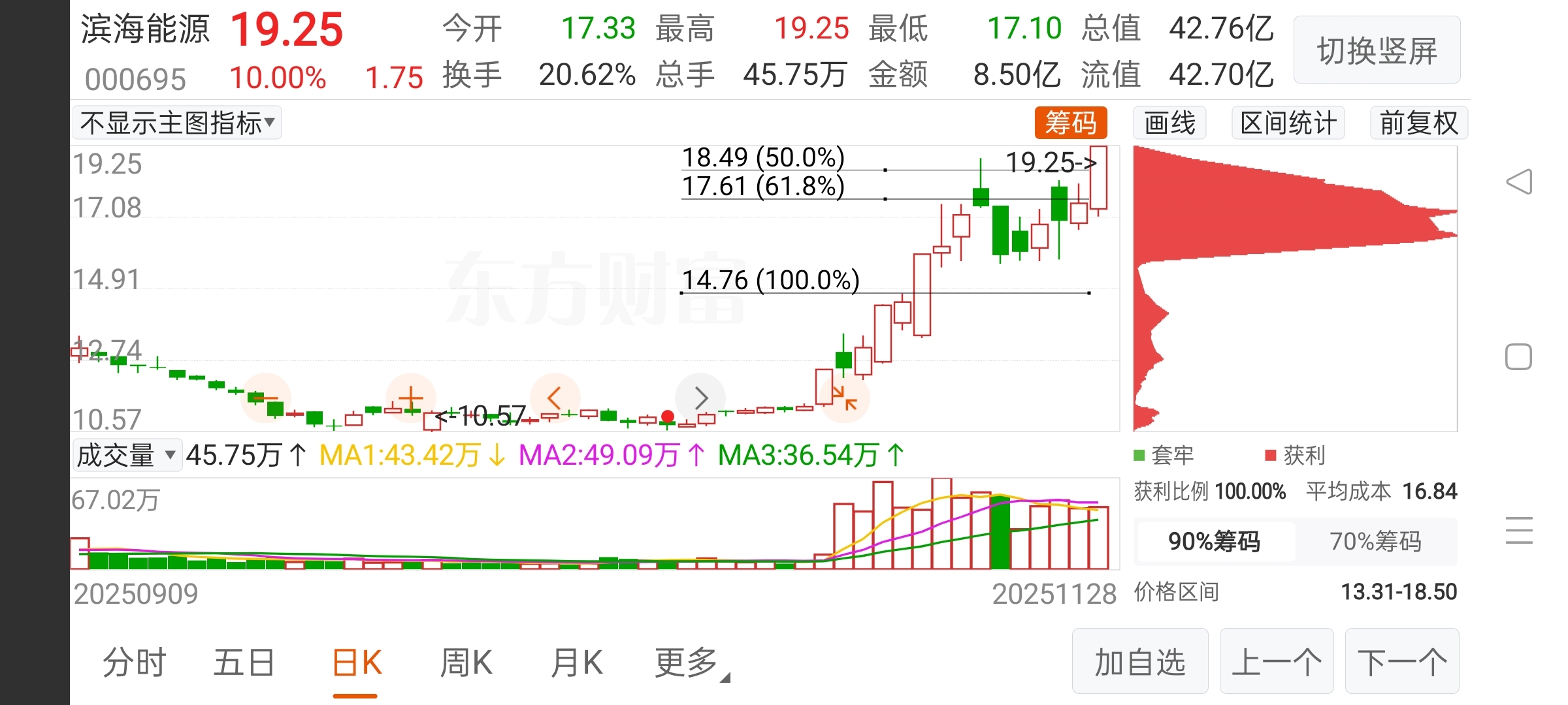 选的三只票滨海能源,日分割线18.5,目前站上左边18.8的高点,周分割线18.96,睿能科技日分割线22.35,周分割线22.82,襄阳轴承日分割线14.48,周分割线14.24