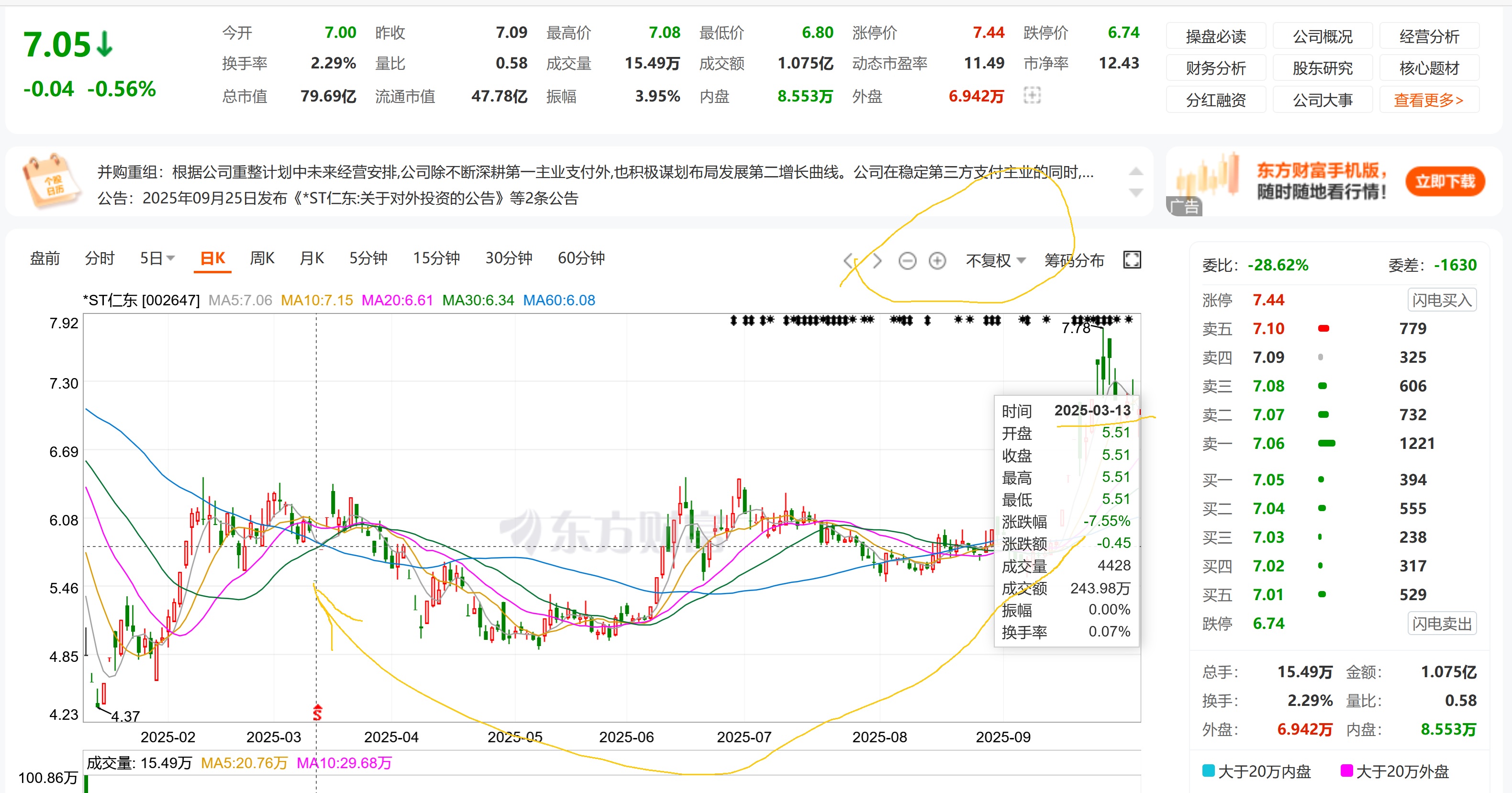 看*ST仁东的日K线的时候,要切换到:不复权。在不复权的界面下,才能反映3月13日中小股东的所持股份的真实价格变化。因为,转增股份没有向中小股东分配!