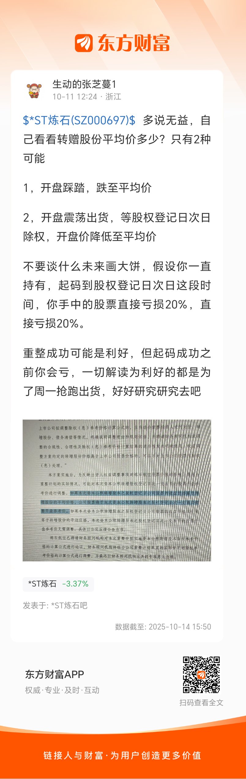 $*ST炼石(SZ000697)$ 多说无益,自己看看转赠股份平均价多少?只有2种可能