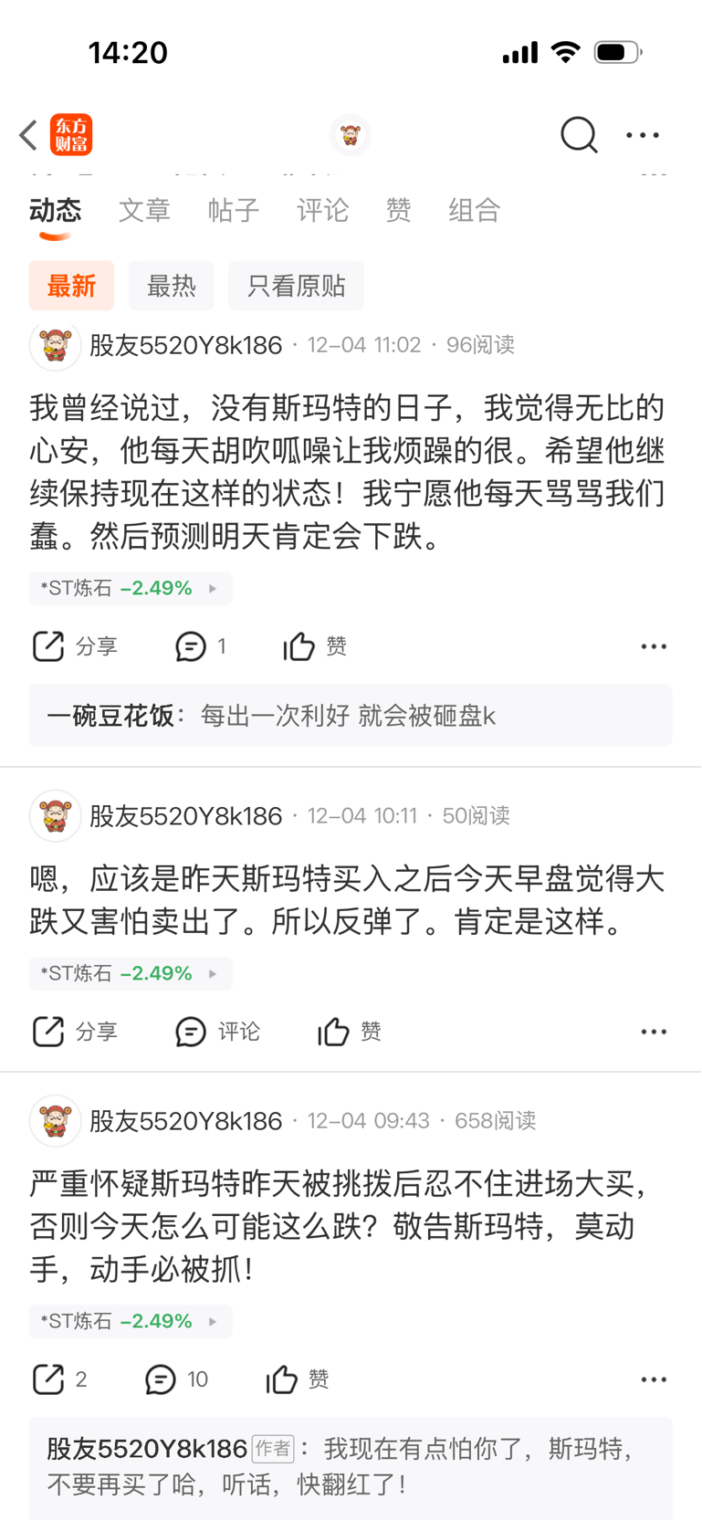 我也不知道怎么说,我早说了多次只要斯玛特买了就要开始跌了。 这个倒霉鬼,真是没办法! 这股票唯一可以平安上涨的期间就是他唱空或者闭嘴的期间。 他真是个叫花的命!
