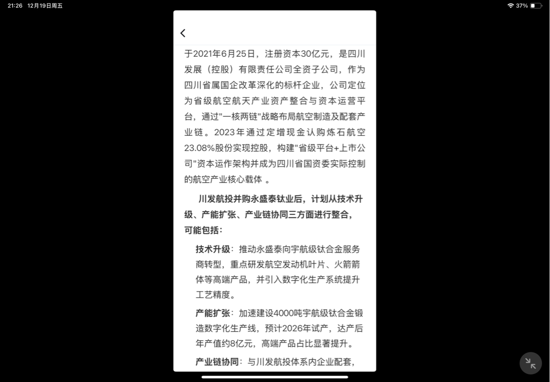 炼石就是四川发展在航空航天板块的唯一资产上市平台!