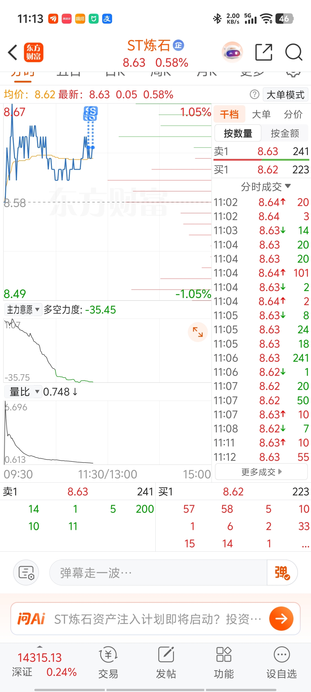 $ST炼石(SZ000697)$ 哈哈,看看这成交,我挂100手8.63卖出,卖了10分钟了还没卖完