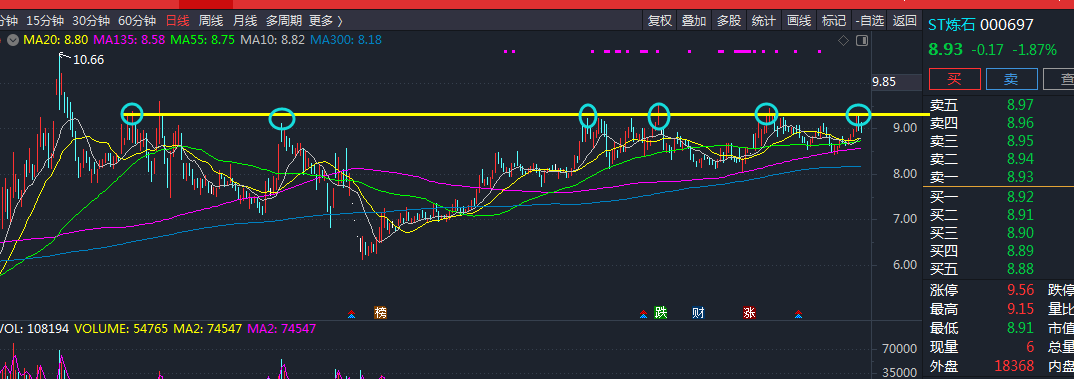 炼石预计不会以一点点挪上去的方式突破这个六点一线阻力线的。肯定是跳起来巨量封死涨