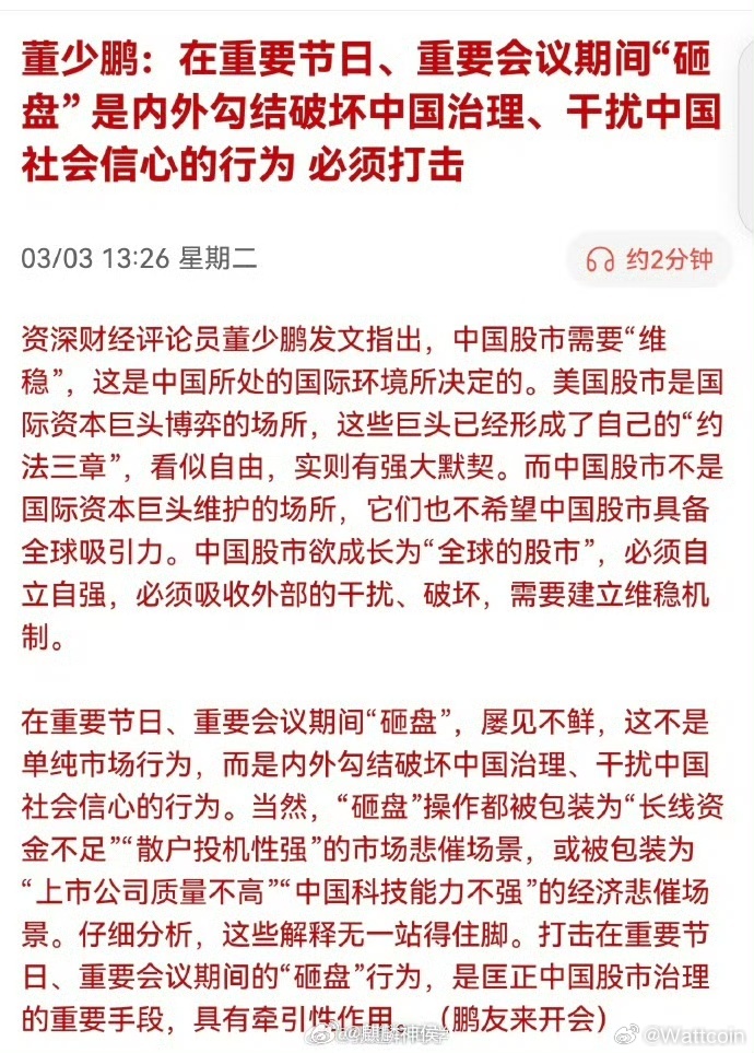 董少鹏:在重要节日,重要会议期间"砸盘"是内外勾结破坏中国治理,干扰中国社会信心的行为必须打击!