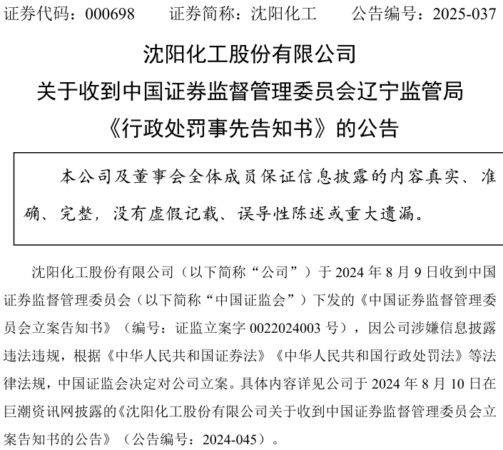 沈阳化工(000698)2025年10月1日收到处罚事先告知书,股民可索赔。