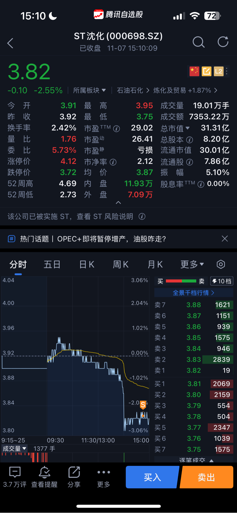 $ST沈化(SZ000698)$ 不知道你们说的什么b站主播带粉丝清仓是真的还是假的,我又不认识他,我只知道破了5日、10日,现在在30日均线,收益不及我的预期,果断出局!等资金后面进来的,我在买,我就是墙头草跟着走,不想参与来回调整,趋势向上我就买,趋势向下我就卖!我也不去做打板追涨杀跌的事情,我就这二两水平,做不了那些神操作!