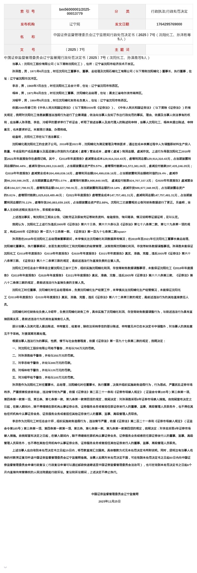 孙泽胜作为沈阳化工时任董事长、总经理及沈阳蜡化董事长、执行董事,是前述违法行为直接负责的主管人员,被给予警告并处以350万元罚款,同时被采取8年证券市场禁入措施。