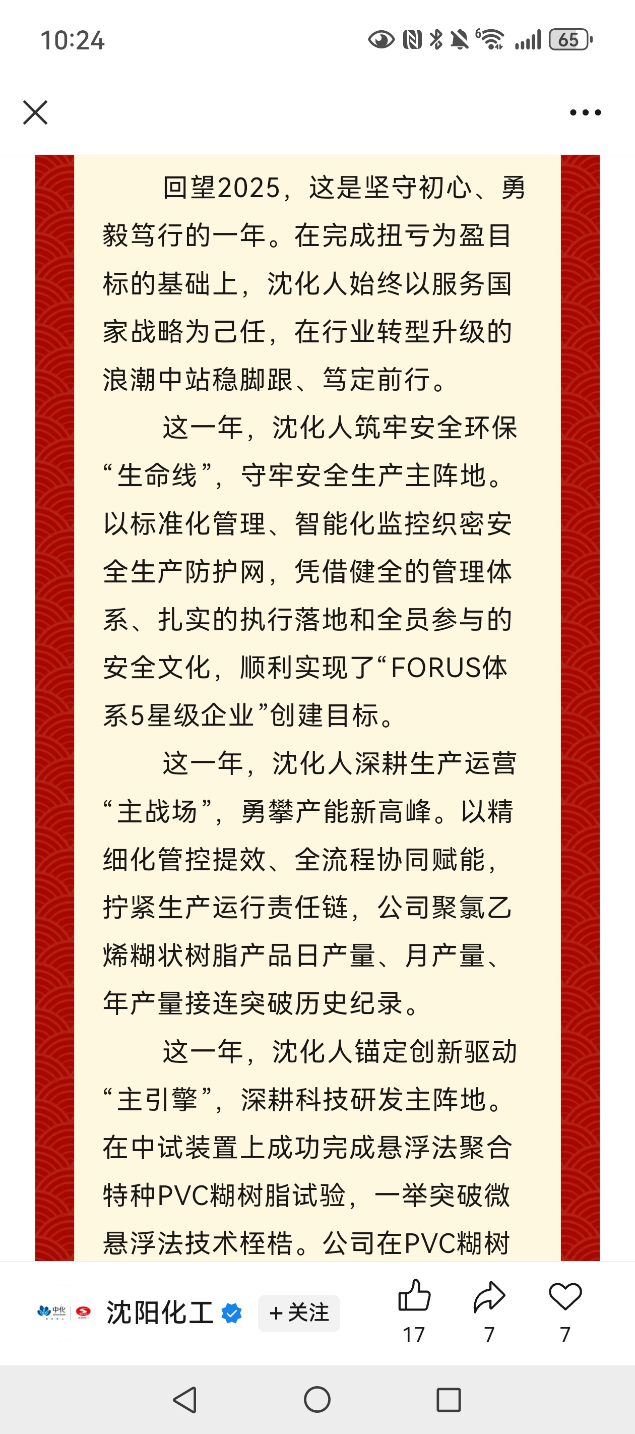 $ST沈化(SZ000698)$ 这一年,沈化人深耕生产运营“主战场”,勇攀产能新高峰。以精细化管控提效、全流程协同赋能,拧紧生产运行责任链,公司聚氯乙烯糊状树脂产品日产量、月产量、年产量接连突破历史纪录。