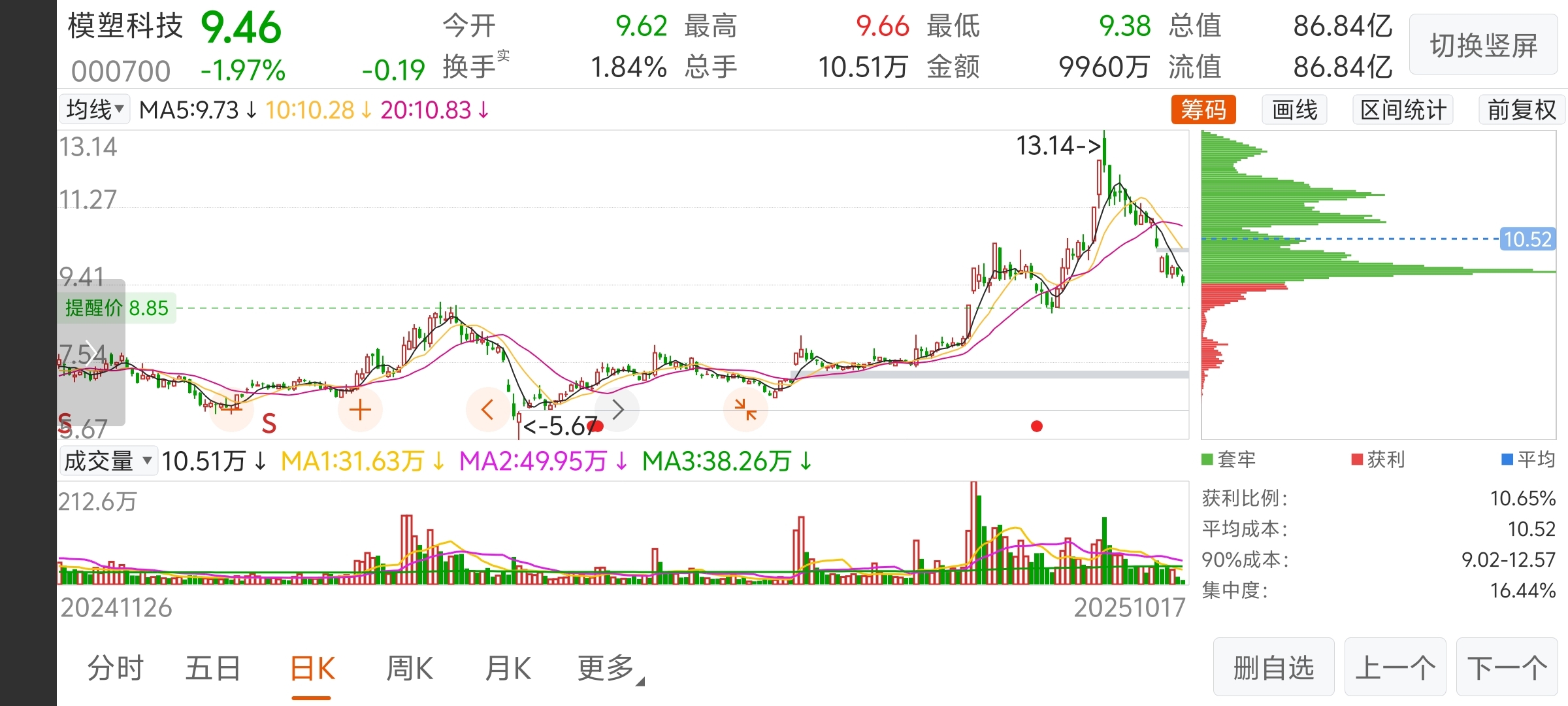 $模塑科技(SZ000700)$ 跌到8.85附近才完美