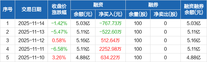 模塑科技:融资净偿还767.73万元,融资余额5.03亿元(11-14)