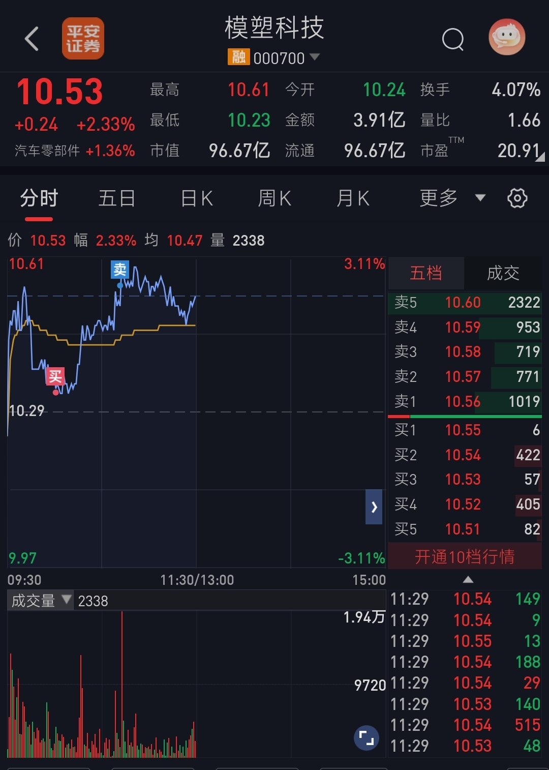 $模塑科技(SZ000700)$ 10.33买了10手,10.55卖掉,再降点成本。还差一个涨停,盈利30%就清仓。