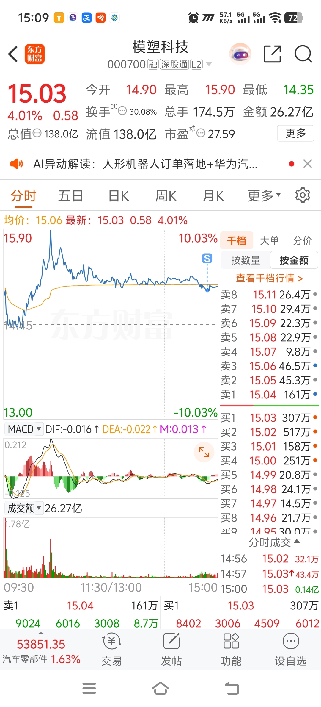 $模塑科技(SZ000700)$ 格局到尾盘,也赚了七个点走了。不过还是看好,另外买的两个尾盘有抢筹的迹象这个好像没有,明天给个低开我接回来