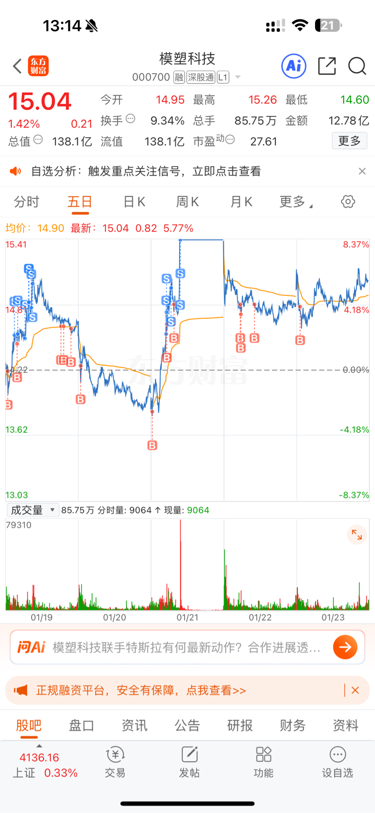 $模塑科技(SZ000700)$ 上周末我又潜伏进来了。下周你可以拉升了!