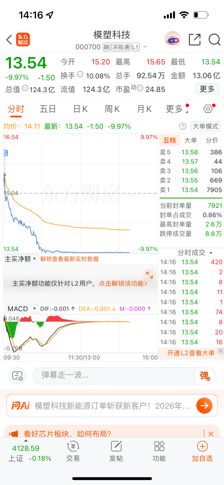 $模塑科技(SZ000700)$ 以往都是卖飞的,今天运气很好