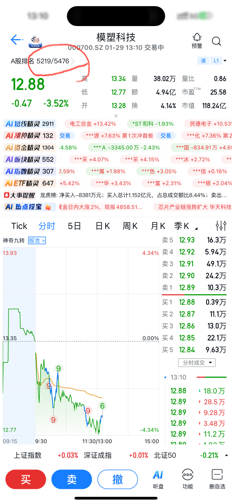 $模塑科技(SZ000700)$ ,全国5476个股票,年前规划,模塑要倒数第一了,