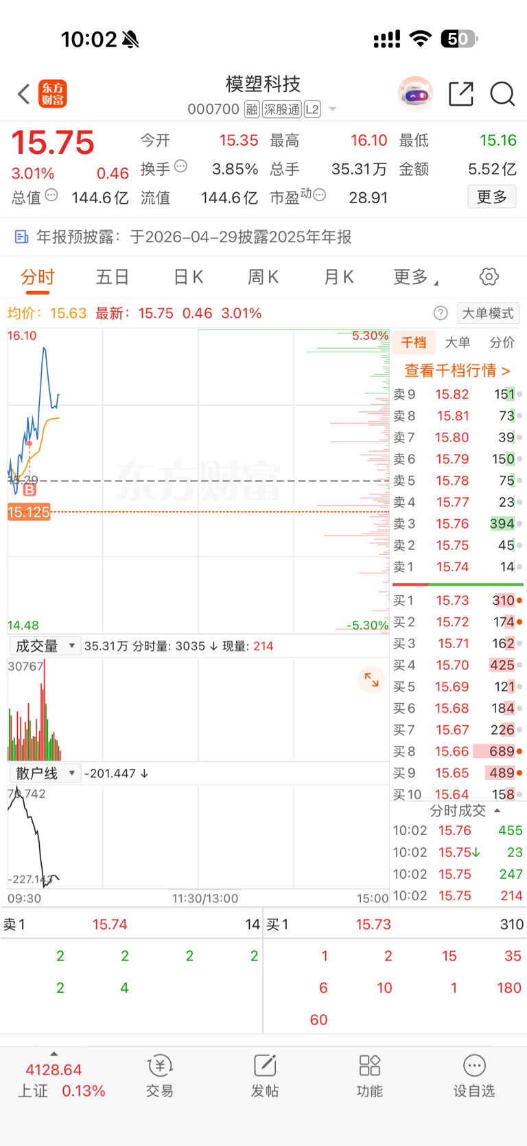 $模塑科技(SZ000700)$ 拿住 16.1摸了一下 解放周五套牢盘 继续持有 先不t 今天有机会板 尾盘什么价格都t