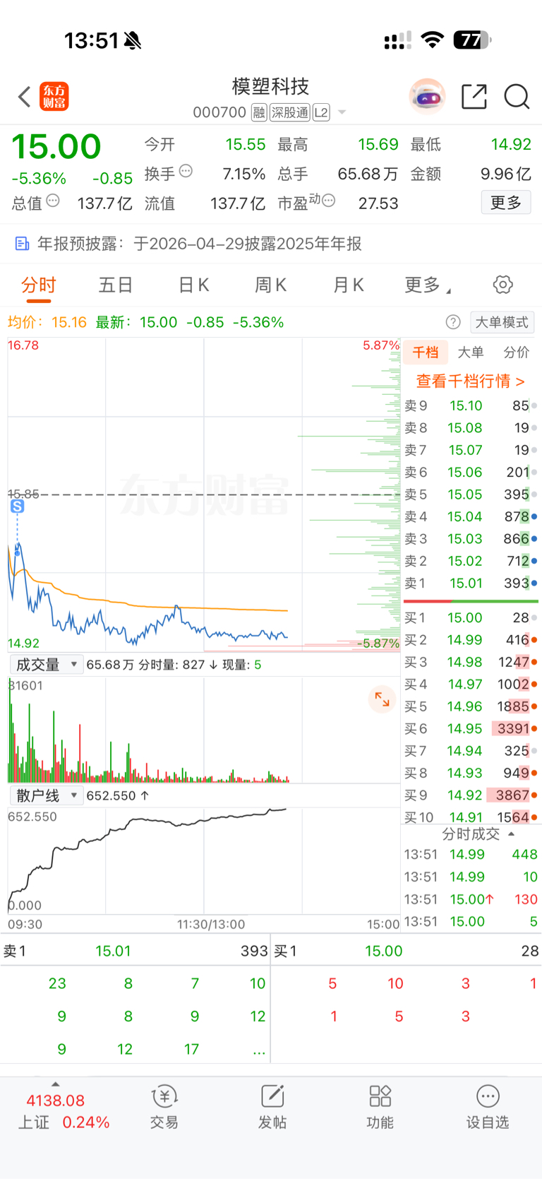 $模塑科技(SZ000700)$ 大家还好吗 难不难受 这主力就是这样恶心人的 16块那里就是来回刷