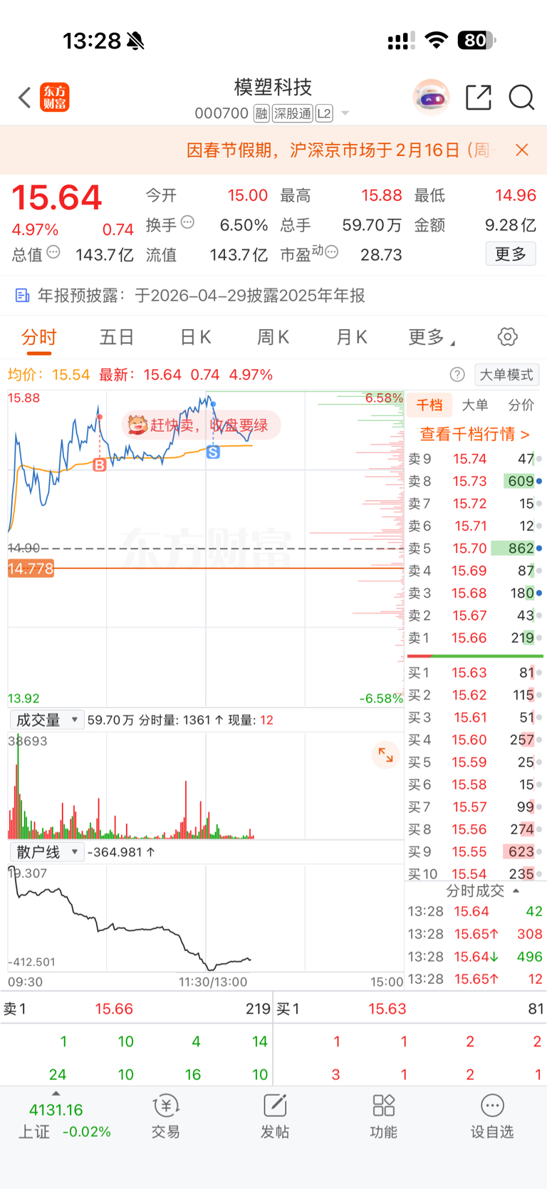 $模塑科技(SZ000700)$ 和前天一样的剧本 明天水下-5接 节后一字板了
