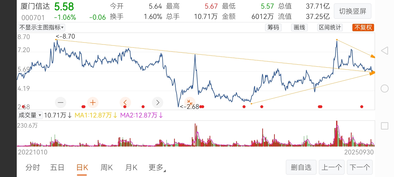 $厦门信达(SZ000701)$ 信达连年亏损,每年业务量都很大但不会赚钱,再亏下去必然退市。而作为其控股股东的厦门国贸系世界五百强国企,如果让信达退市在如火如荼的大牛市背景下国贸集团领导将无法向厦门市各方面交代并会导致因不积极作为而被追责。在同为厦门国企上市公司厦门港务己经定增注入集团港口资产的成功案例指引下,厦门国贸必然启动注入集团新质生产力优质资产到信达,以挽救信达连年亏损滑向退市的悲剧和不可承受的退市后果。从信达剥离子公司和收购京东数字来看,其转型之路己经开始。时间上来看,到年底剩下的3个月是公布转型的时间窗口期。技术上,信达月线放出上市有史以来天量,出现量价异动并放量突破长期压力线,现在己缩量回调到位(均线归位)在重组转型预期下己经是跌无可跌,一旦转型方案公布,必将在牛市背景下一飞冲天,走出三浪三主升浪走势,让我们拭目以待。附技术走势分析图,个人分析,仅供参考。