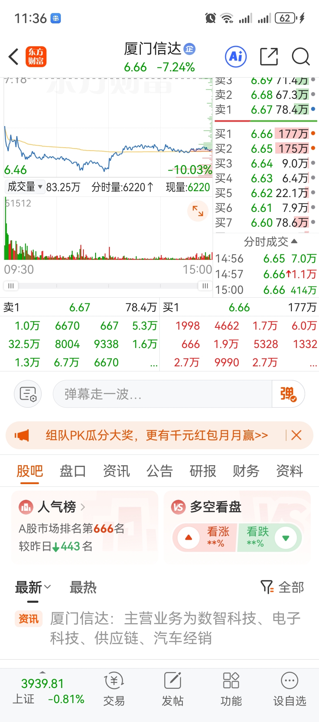 $厦门信达(SZ000701)$ 股价6.66,排名666