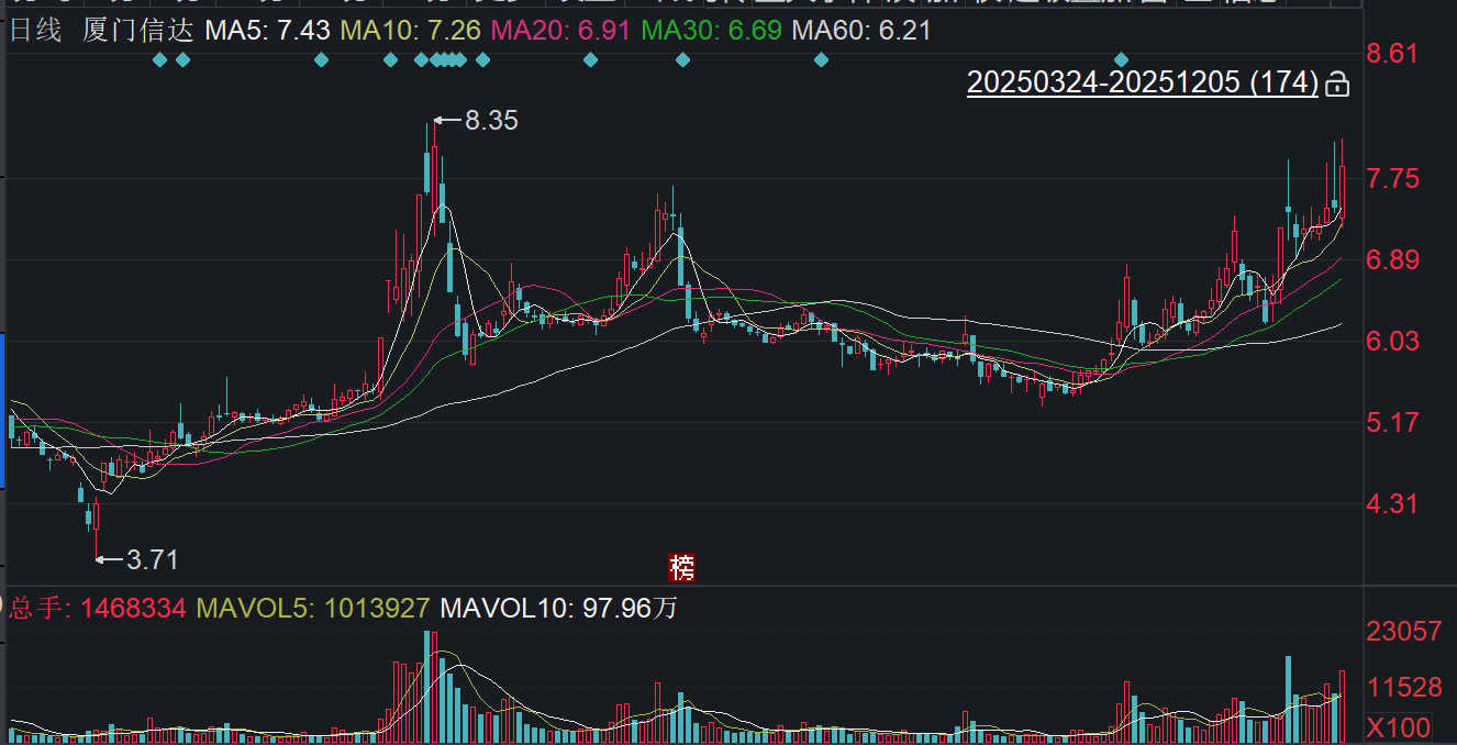二级市场上,截至12月5日收盘,厦门信达上涨5.93%报7.86元/股,盘中涨停后回落,总市值约53.12亿元,今年来公司股价累计上涨超七成。