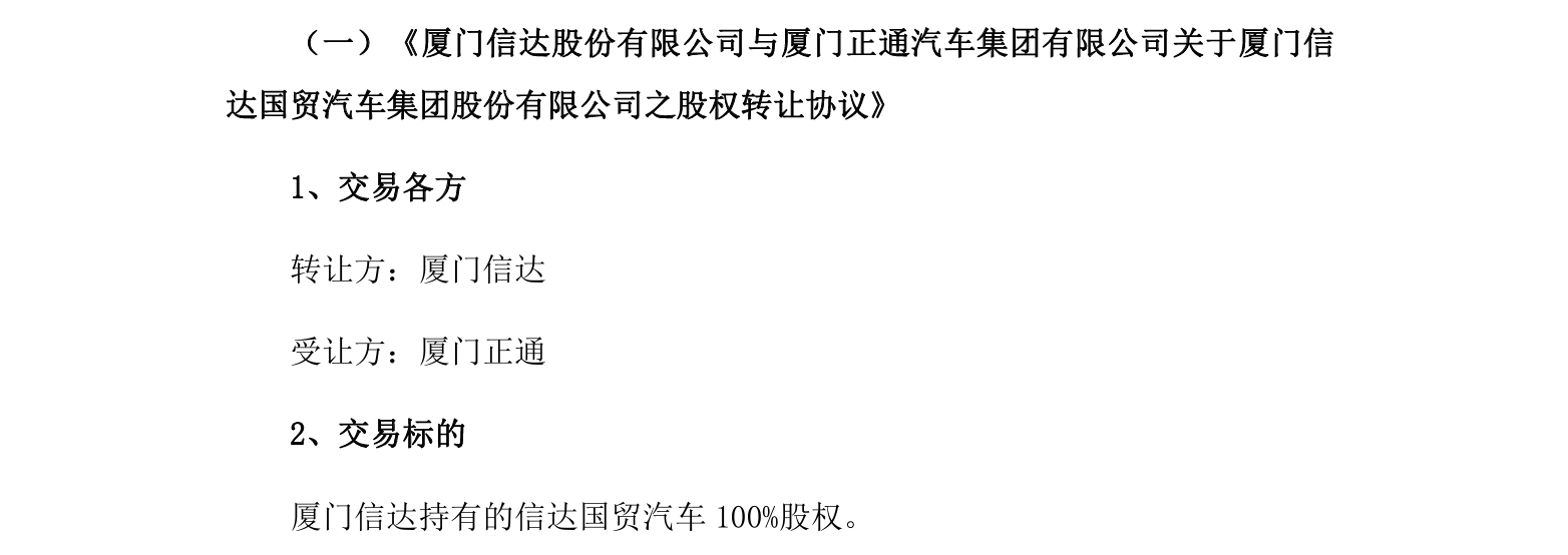 同时,针对公司与正通汽车在汽车经销领域存在的业务相同或相似情况,公司控股股东国贸控股已于2022年11月出具《关于解决与厦门信达在汽车经销业务领域存在业务相同或相似情况的承诺》,本次交易也是履行承诺并解决在汽车经销领域存在的业务相同或相似情况的举措。
