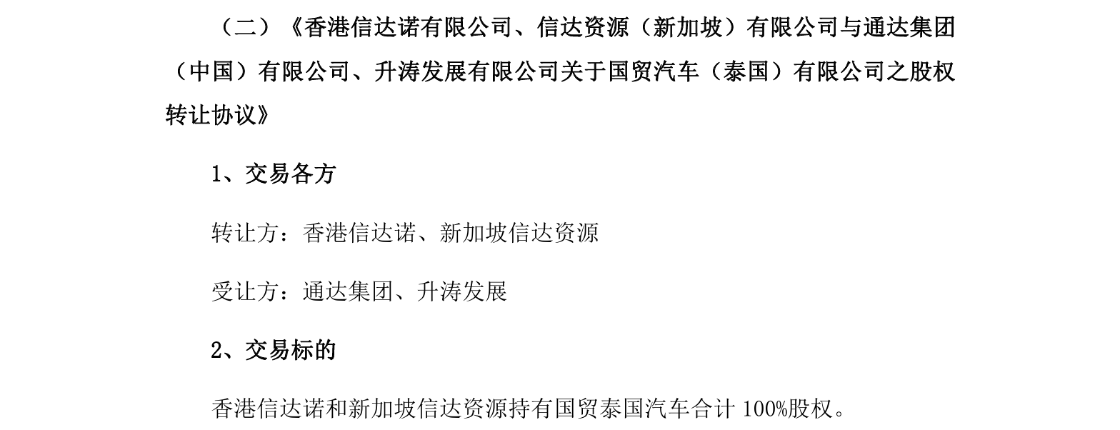 公司全资子公司香港信达诺将以1992.14万元的价格,向正通汽车全资子公司通达集团出售所持有的国贸泰国汽车90%股权;公司全资子公司新加坡信达资源将以221.35万元的价格,向正通汽车全资子公司升涛发展出售所持有的国贸泰国汽车10%股权。