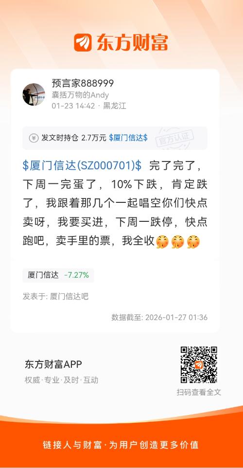 $厦门信达(SZ000701)$ 完了完了,下周一完蛋了,10%下跌,肯定跌了,我跟着那几个一起唱空你们快点卖呀,我要买进,下周一跌停,快点跑吧,卖手里的票,我全收