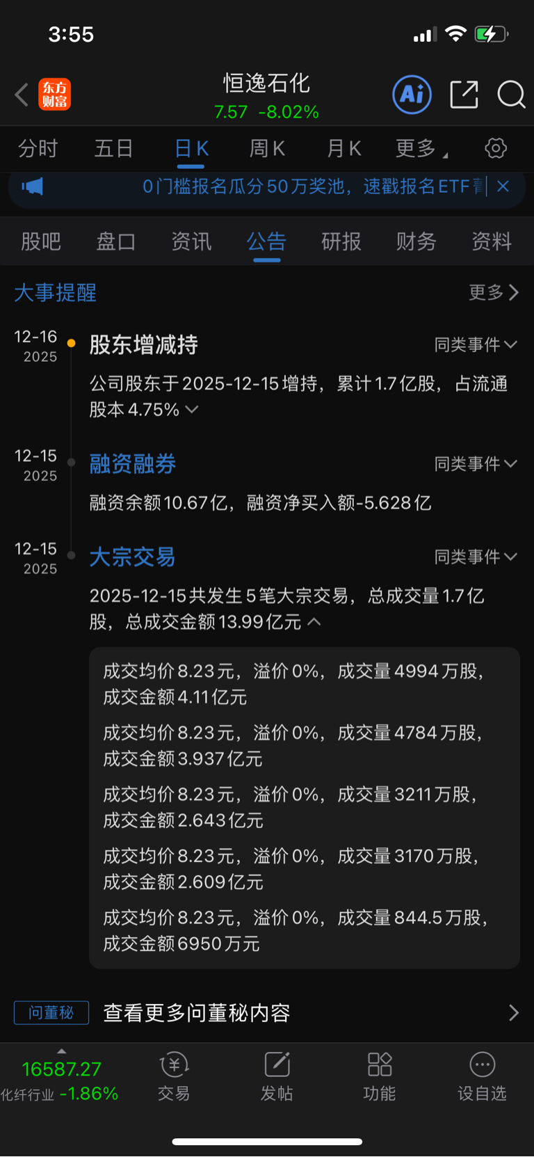 $恒逸石化(SZ000703)$ 难怪和跌,什么增持15-25亿,就是左手倒右手,又不是集合竞价买入,利空,所以大跌