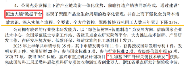 技术投入方面,恒逸以“恒逸大脑”推动智能制造,聚酯板块万人用工三年下降25%,显著降低人工成本;新凤鸣则更注重材料创新,已获批“生物基PEF纤维关键技术”等省级重点研发项目,并与东华大学共建联合实验室。前者提升效率,后者拓展边界,都是好方向,但后者更可能在未来打开第二增长曲线。