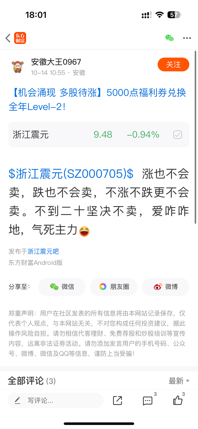 温馨提示: 1.根据《证券法》规定,禁止编造、传播虚假信息或者误导性信息,扰乱证券市场;2.用户在本社区发表的所有资料、言论等仅代表个人观点,与本网站立场无关,不对您构成任何投资建议。用户应基于自己的独立判断,自行决定证券投资并承担相应风险。《东方财富社区管理规定》