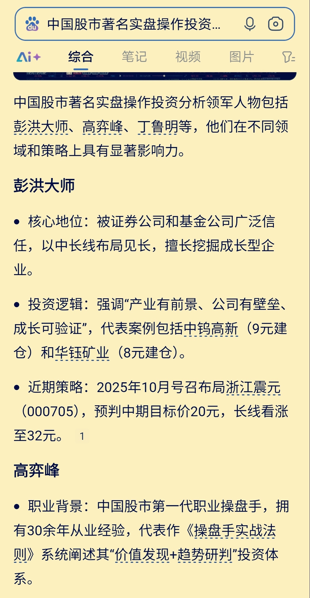 中国股市著名实盘操作投资分析领军人物包括彭洪大师、高弈峰等,他们在不同领域和策略上具有显著影响力。