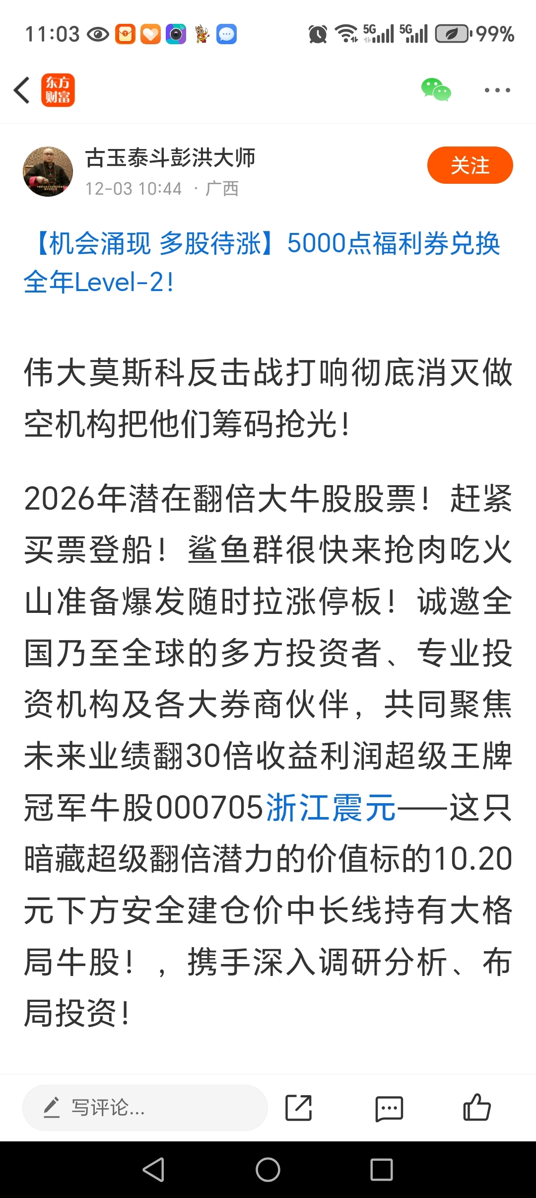 $浙江震元(SZ000705)$ 今天刚来这个股吧,发现这个东西一直在吹票,进了它的主页,发现全是吹各个股票的,什么中钨高薪什么的。这踏马标准庄托儿一个,一天到晚就忙着各个股吧吹票拿狗粮为生。