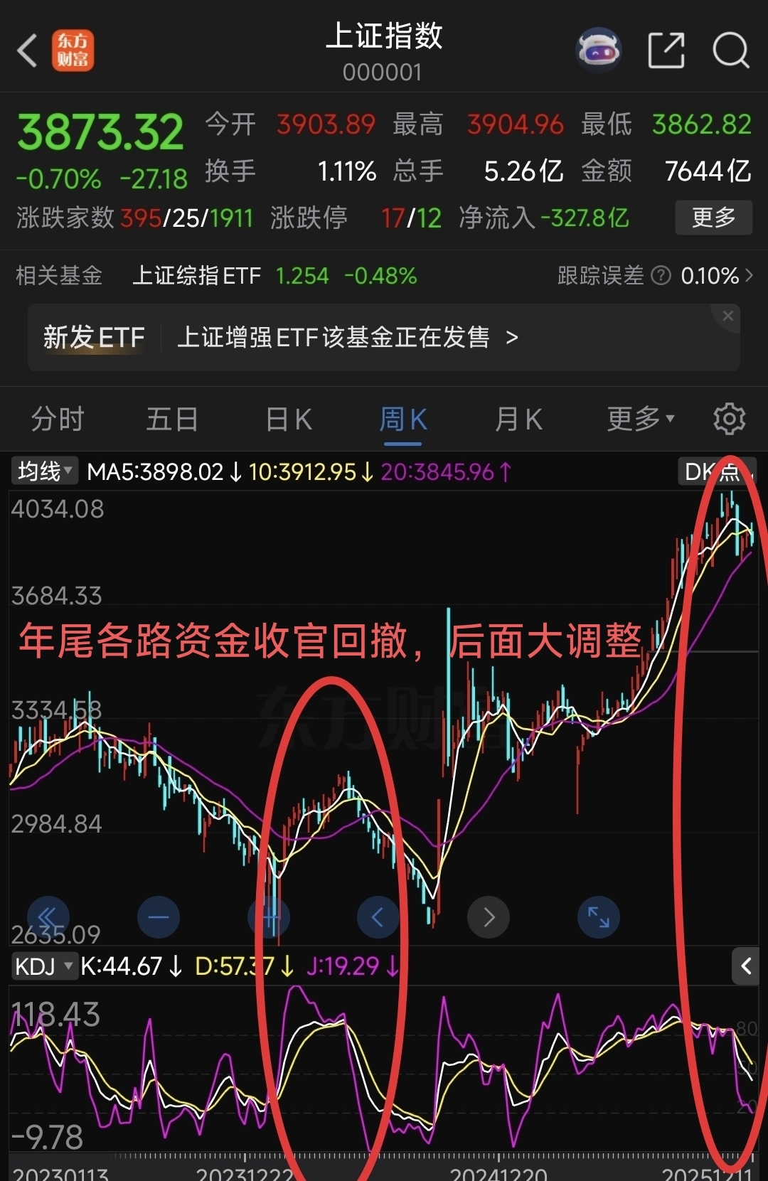 $浙江震元(SZ000705)$ 此阶段现金为王,一股不留:日线看波动,周线看趋势,月线定生死。看看上证指数现在形态,资金年关收尾,大盘个股只是一粒沙子,随大潮流,上证周线KDJ己形成死亡金叉,后面将积云成雨带来恐慌,想跑也没人接,个股会空跌形成几周连长阴!现在现金为王,等周线KDJ在低位金叉往上再进场才是明智!
