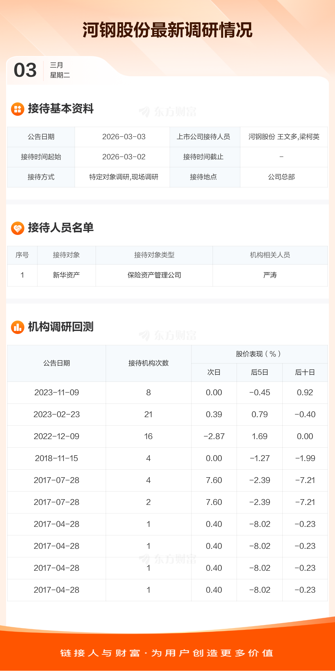 河钢股份3月3日公告称,3月2日接待新华资产等1家机构调研。接待人员包括河钢股份 王文多,梁柯英。