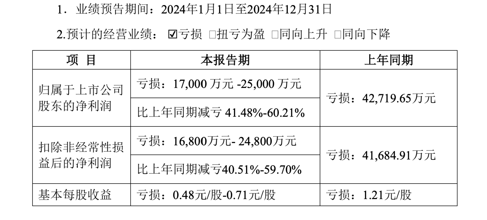 2024年,公司仍亏损但减亏明显:归属上市公司股东净利润预亏1.7亿-2.5亿元,较上年减亏41.48%-60.21%;扣非后净利润预亏1.68亿-2.48亿元,减亏40.51%-59.70%;基本每股收益预亏0.48-0.71元/股,上年亏1.21元/股。