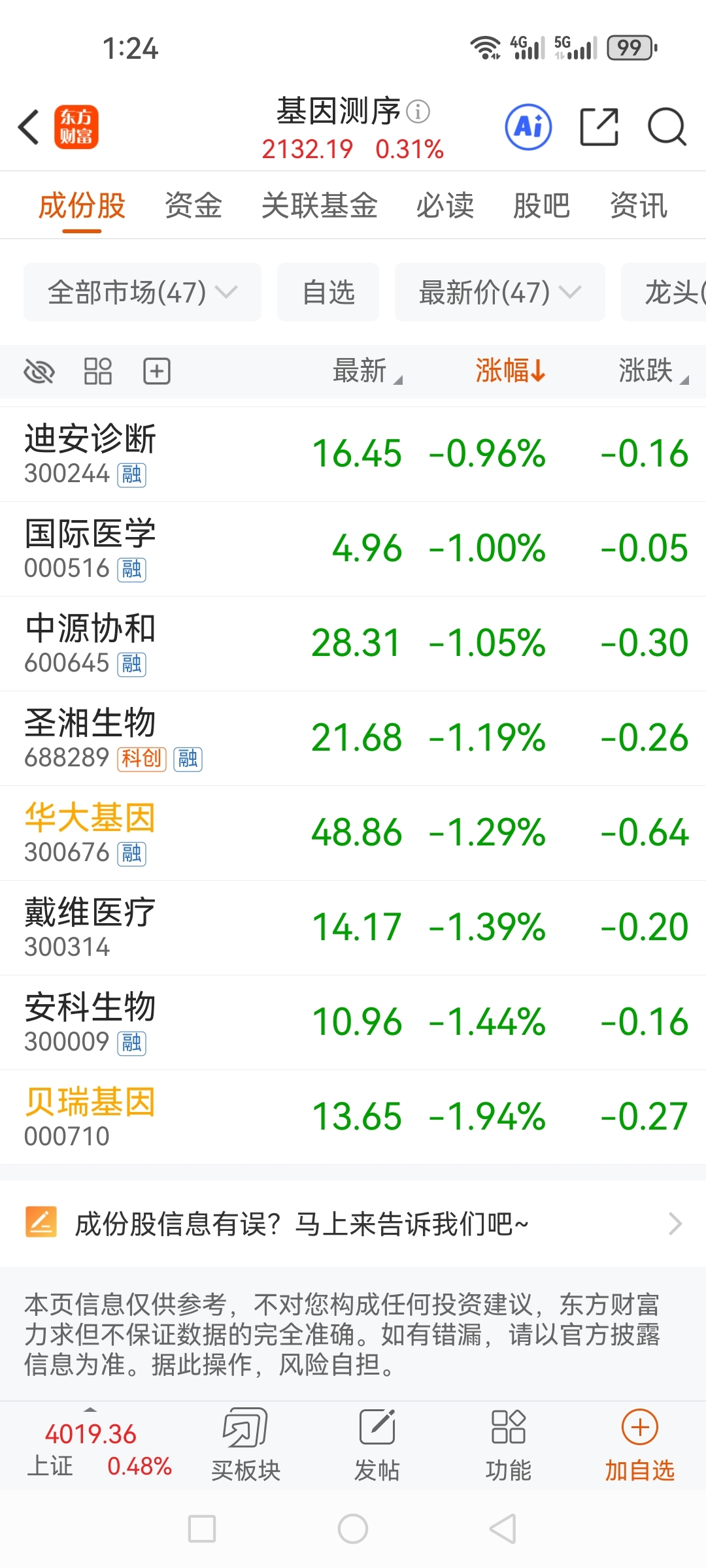 $贝瑞基因(SZ000710)$ 板块垫底