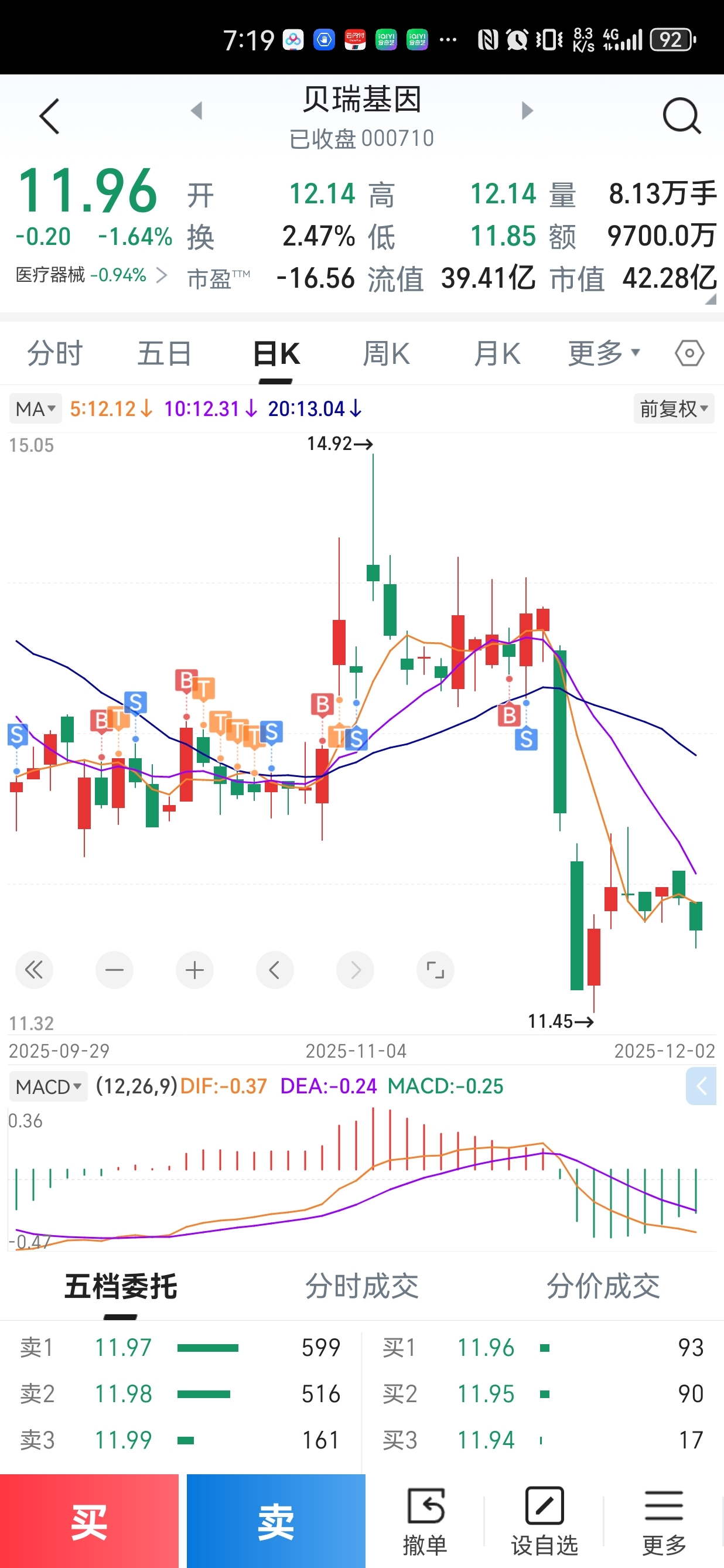 $贝瑞基因(SZ000710)$ 可以跑了100股