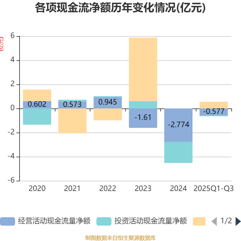 2025年前三季度,公司经营活动现金流净额为-5767.63万元,同比增加2.24亿元;筹资活动现金流净额5562.06万元,同比增加7493.53万元;投资活动现金流净额-674.19万元,上年同期为-1.48亿元。