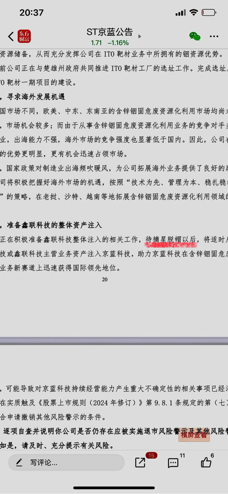$ST京蓝(SZ000711)$ 摘星不摘帽,影响注入?一直在想这个问题,