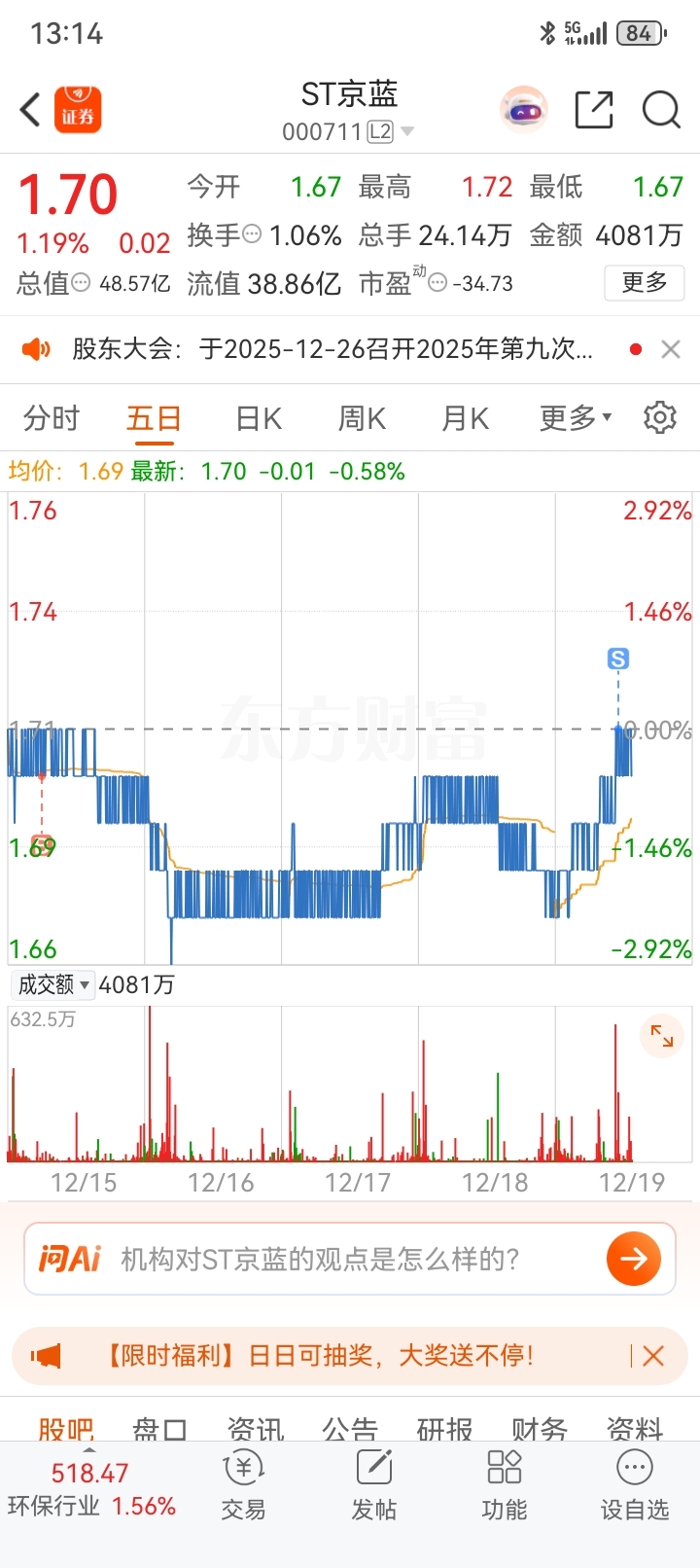 $ST京蓝(SZ000711)$ 礼拜一进来的守了一个礼拜,走了,太慢了
