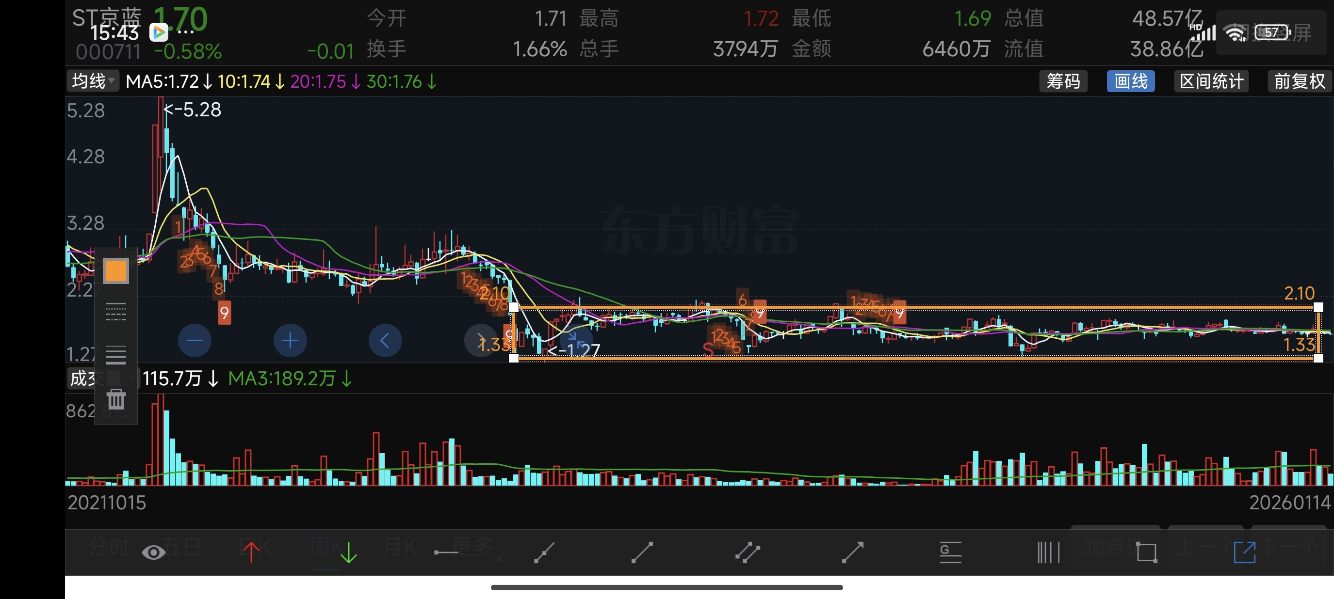 $ST京蓝(SZ000711)$ 周线级别,平台整理了141周,成交量近期明显放大,资产注入的消息也有了,缺点盘子有点大,高度看到3.33。
