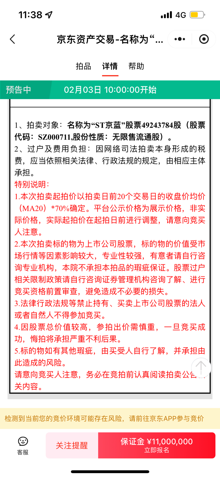 $ST京蓝(SZ000711)$ 这波上涨应该是要提高2月3日的拍卖价 前一段时间拍卖成交价是1.65左右一股成交的。 哪位数学天才算一下 起拍价如果1.4到1.5股的话京蓝科技2月3日前二十个交易日均价得到多少?还有前二十日均价还得*70是对应多少钱?我文凭低不会算哈哈哈