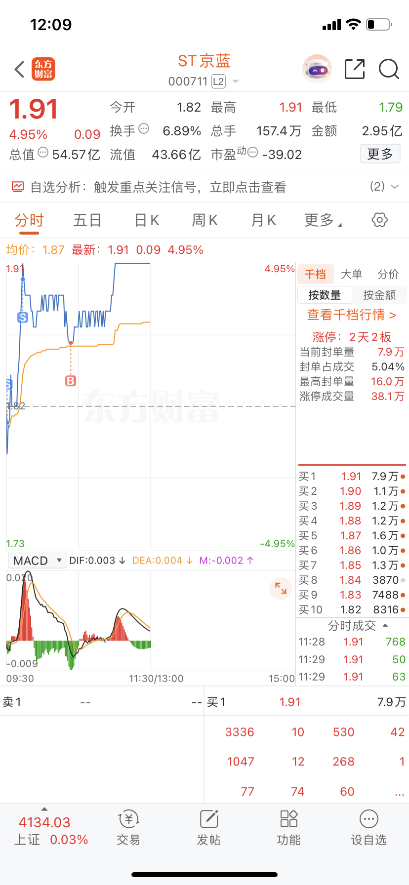 $ST京蓝(SZ000711)$ 开盘被吓出来了一部分,做了个踢,挽回一部分损失。心态还是太差了。说好的底部拿稳到摘帽的。