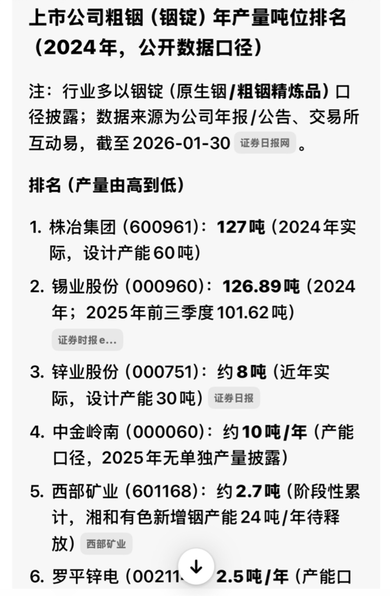 年产量第一是株冶集团127吨,未来随着鑫联科技合并报表,铟靶新材将遥遥领先。
