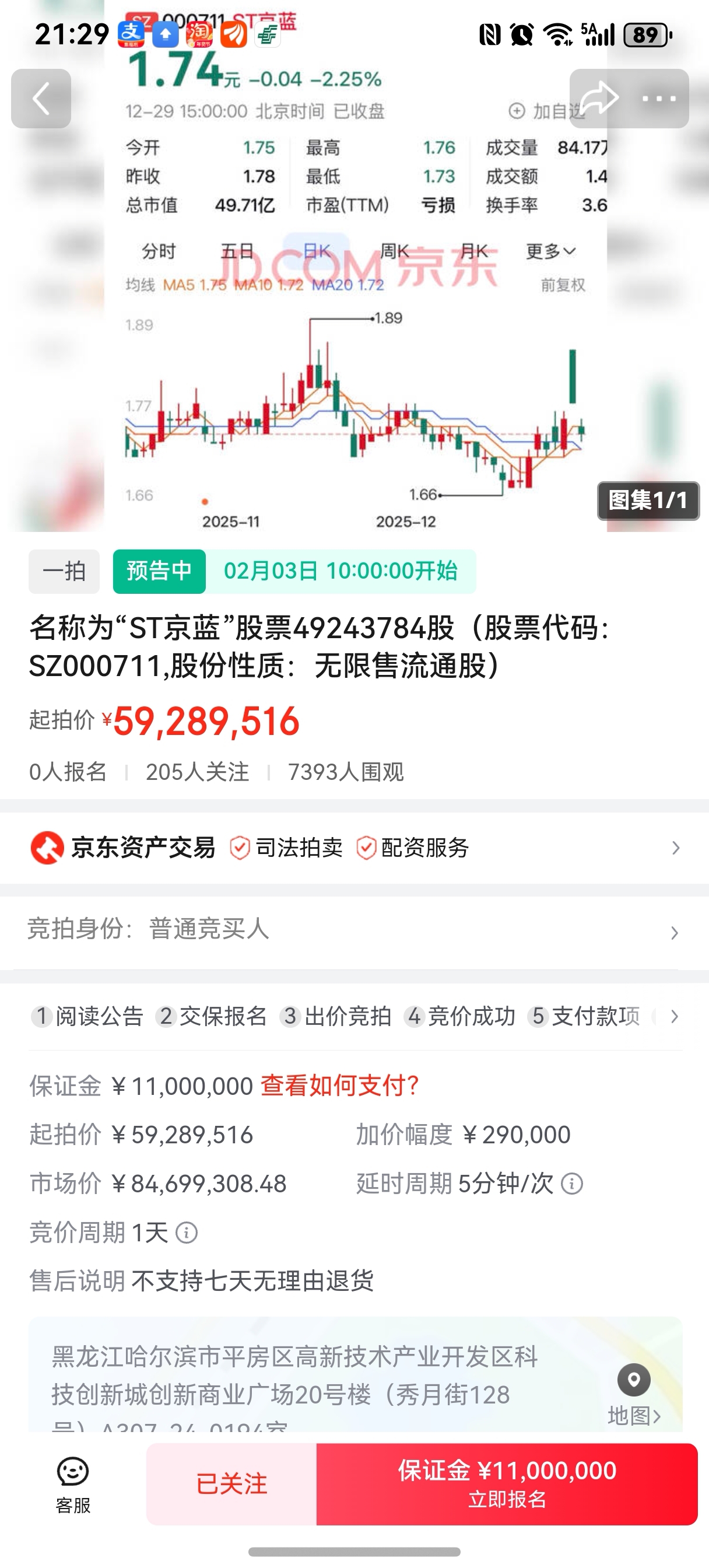 $ST京蓝(SZ000711)$ 2月3号的拍卖怎么没人报名呢?难道会流拍