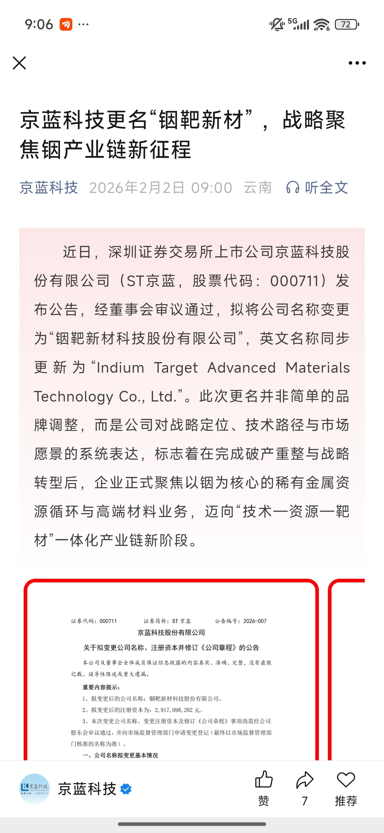 $ST京蓝(SZ000711)$ 京蓝今天公众号,开盘助攻