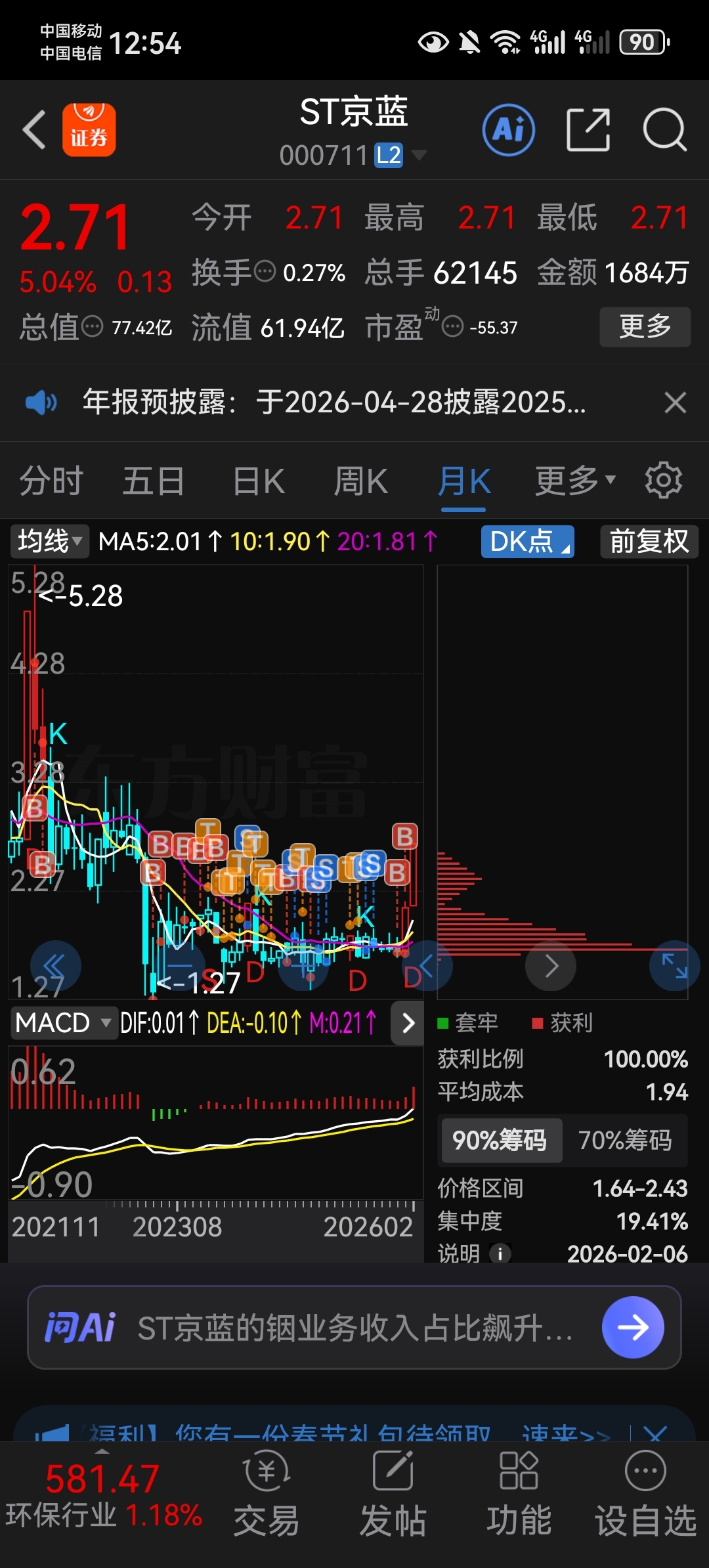 $ST京蓝(SZ000711)$ 四块多钱时买入的,然后一路加仓做T,现在挣40多个点了。