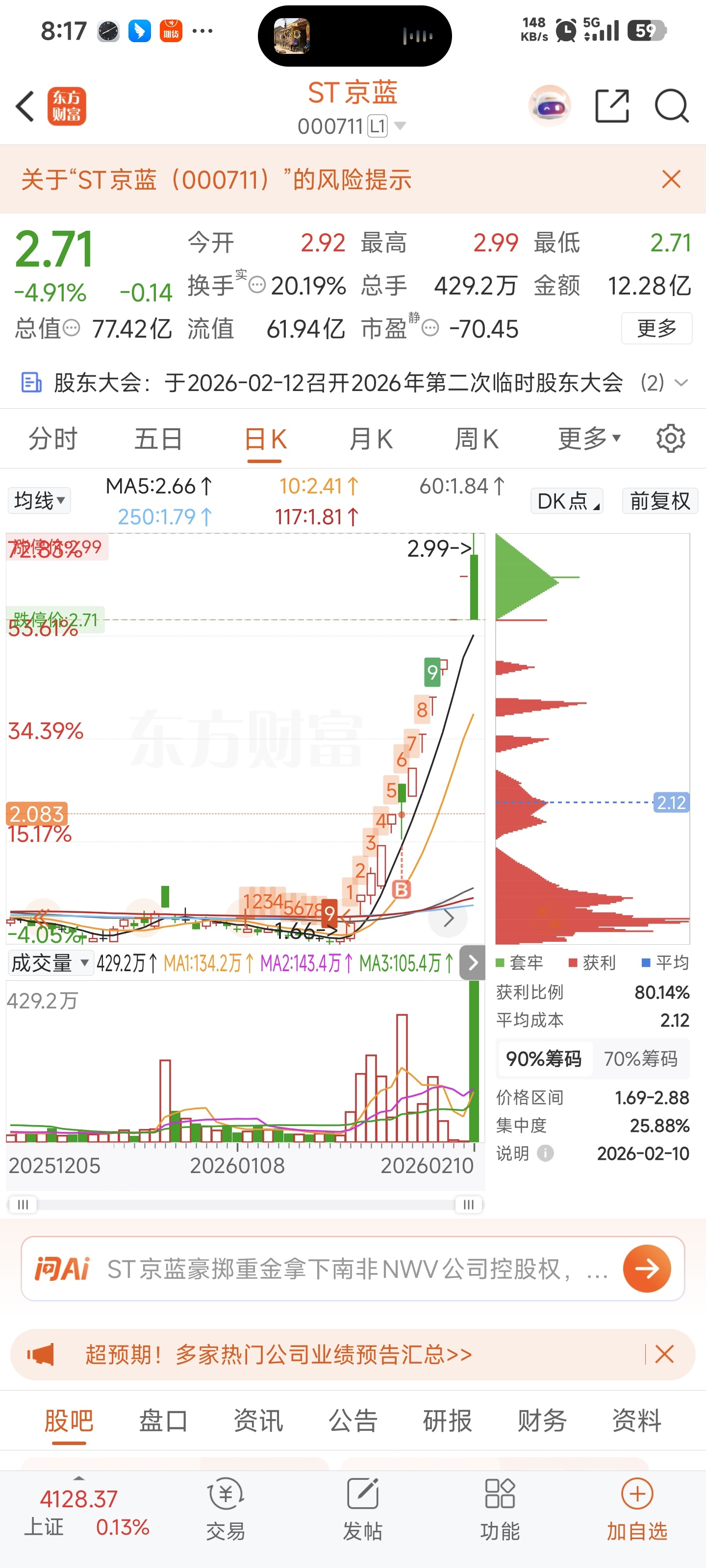 $ST京蓝(SZ000711)$ 如果你看好他你就持有它,不要让分时图影响你的判断,如果它远远低于你预期的价值,那你就陪伴他一起成长。