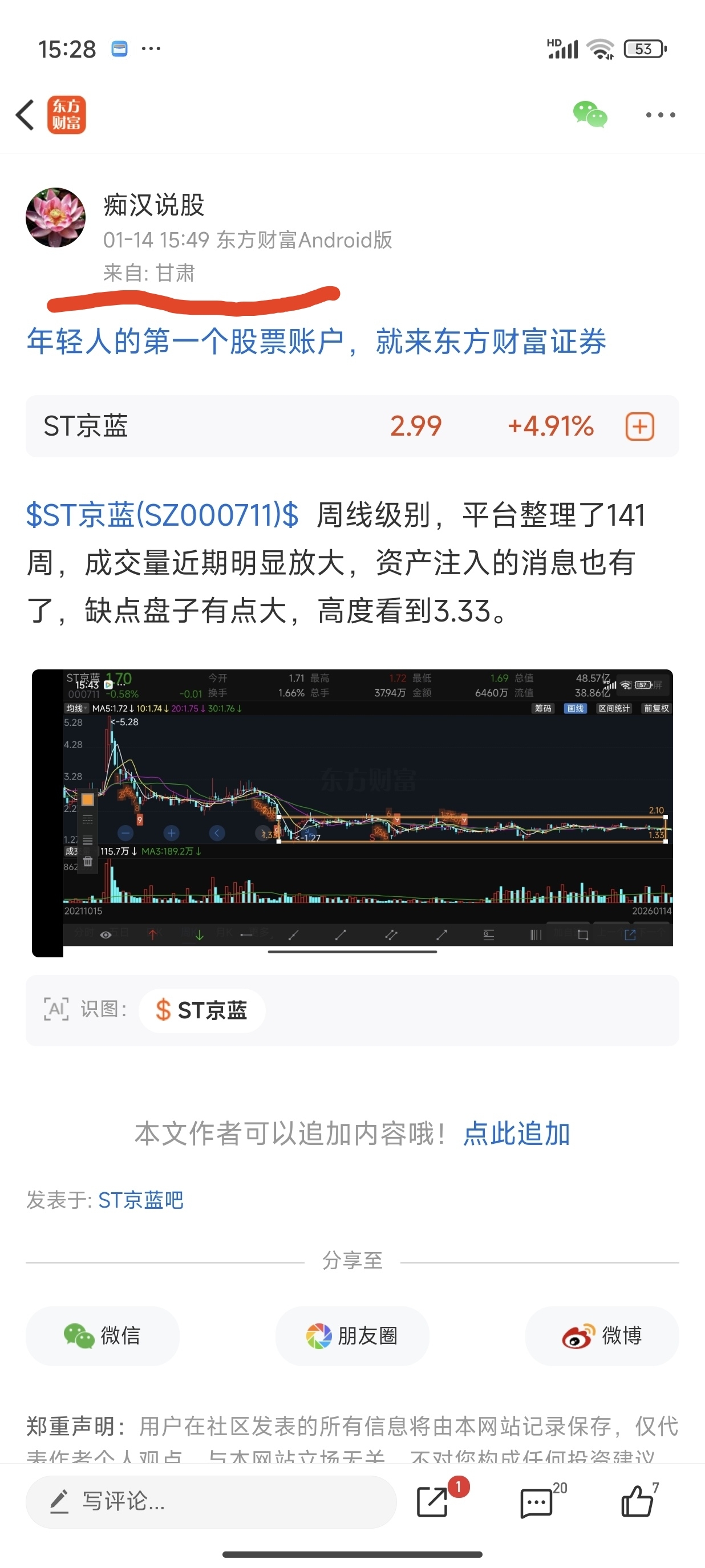 $ST京蓝(SZ000711)$ 大家说说,3.33能到吗?